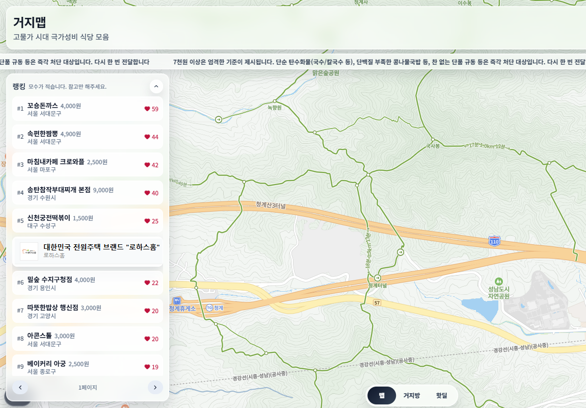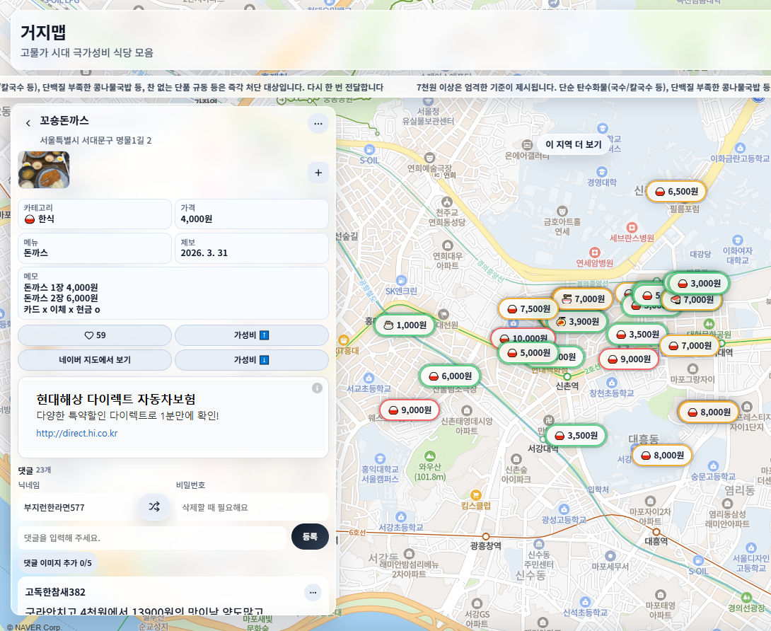 거지맵은 가성비 좋은 식당 정보를 지도 기반으로 확인할 수 있는 웹 서비스로, 사용자들이 직접 방문한 저렴한 식당 정보를 공유하는 플랫폼입니다.